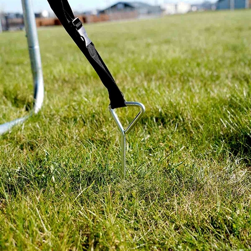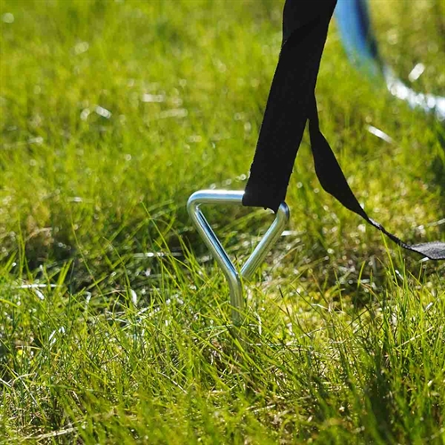 ⚙️ Fastgør til Trampolinen: Jordankrene fastgøres sikkert til trampolinbenene ved hjælp af de medfølgende stropper.